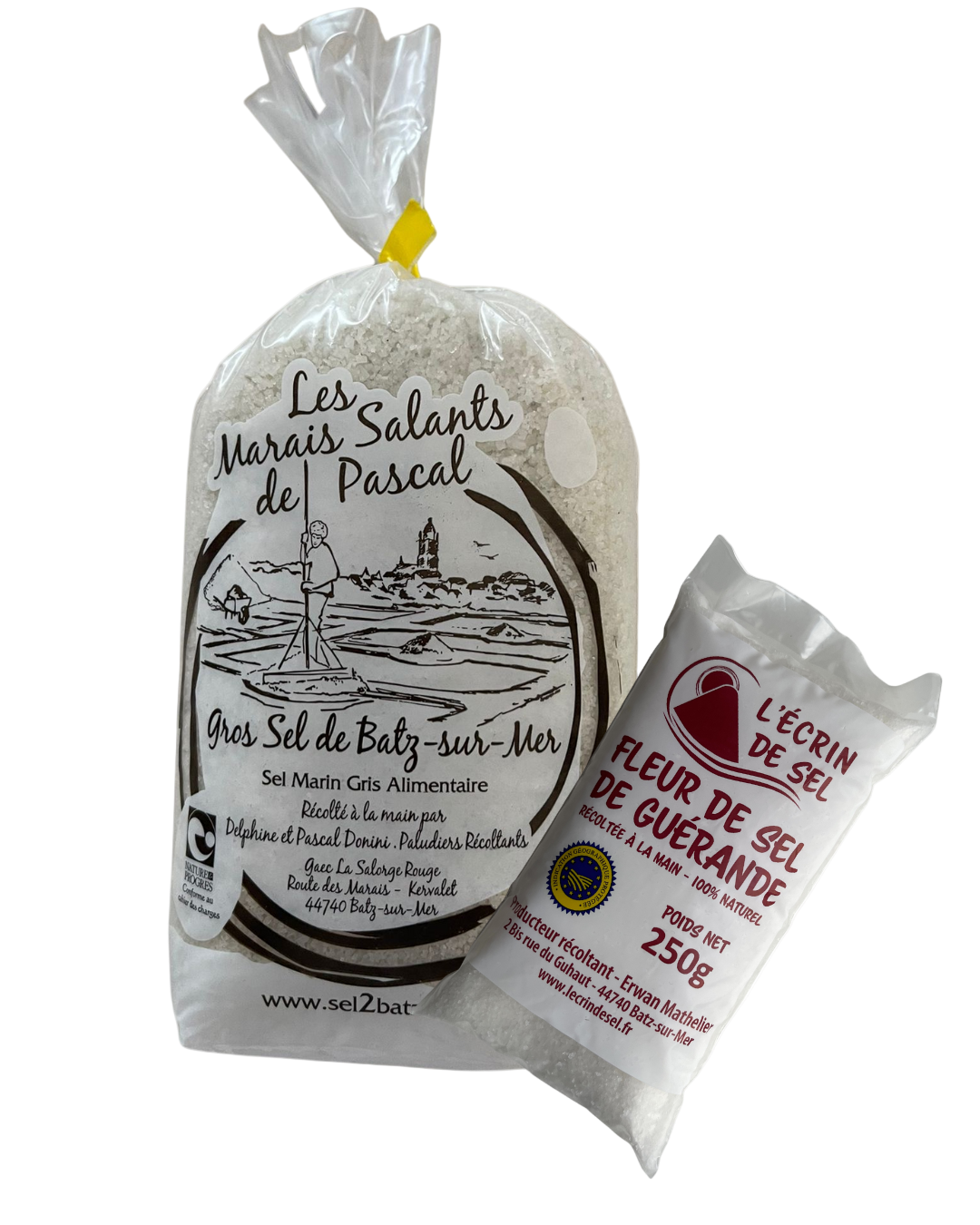 Rinkini sudaro 1kg Gros Sel Stambios druskos bei 205g Fleur de Sel Smulkios Stalo druskos.